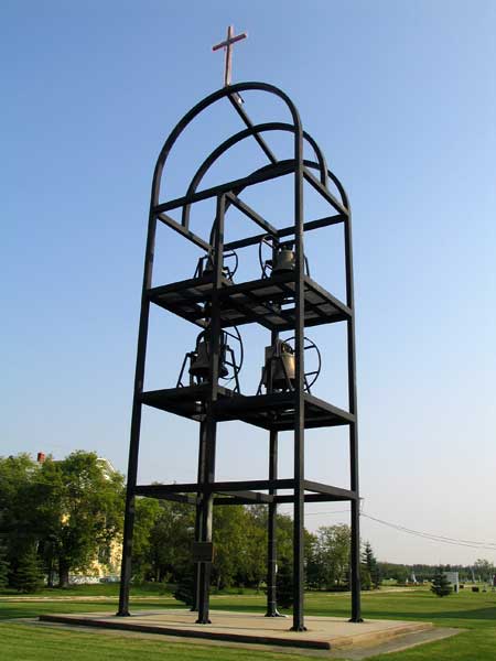 In front of this church, built in 1903 in St. Eustache in the Rural Municipality of Cartier, is a collection of carillon bells. The bells were purchased in 1928 from the French firm of La Compagnie Paccard. Named “Jesus”, “Marie”, “Joseph” and “Therese”, the four bells ring the notes fa-sol-la and do. In 1988, these bells were removed from the deteriorated church steeple and, two years later, a bell tower was built and erected by Sperling Welding. The electrification was done by Marc Goudreau of Quebec in 1994.