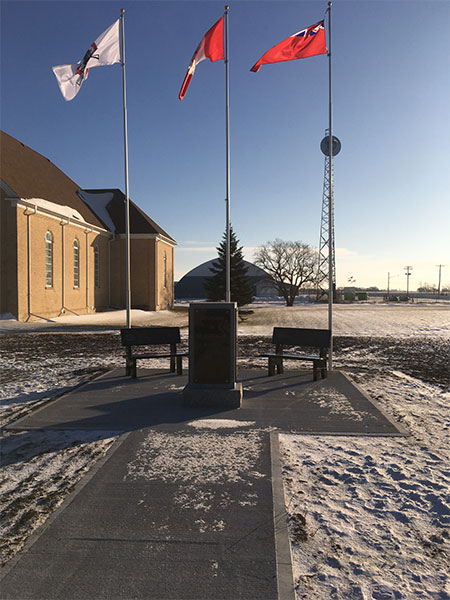 On 11 November 2017, a war memorial on the grounds of the church, funded by the Manitoba Metis Federation, was dedicated. It contains the names of local residents killed during service in the First World War and Second World War.