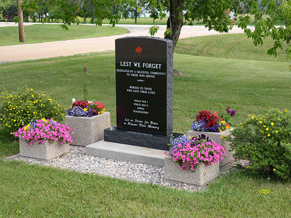 This monument by the municipal office at St. Francois Xavier in the Rural Municipality of St. Francois Xavier commemorates local residents who were killed during service in the First World War, Second World War, Korean War, and during peacekeeping activities.