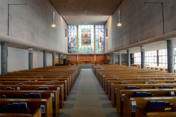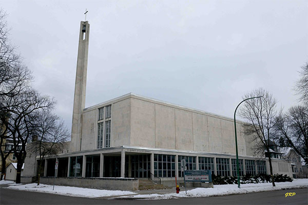 The original church building was demolished in 1957 to make way for the present modernist structure designed by architects G. Leslie Russell and David F. Thordarson from the firm of Green Blankstein Russell and Associates, and built between 1957 and 1958. It features a 132-foot bell tower and a large stained glass window by Leo Mol.
