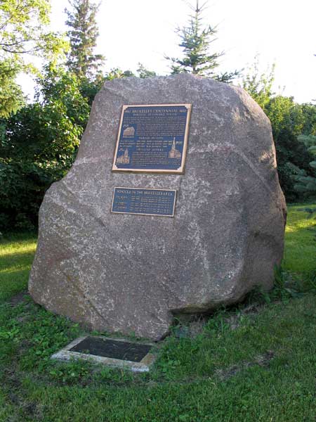 A plaque commemorating the 100th anniversary of the St. Gerard Parish (1892-1992) was installed in recognition of Archbishop Tache of St. Boniface whose colonization efforts attracted homesteaders to this area of “La Montagne Pembina” prior to and following the establishment of Bruxelles in 1892. The Parish was so named because its first priest, Father Gustave Willems, came from the capital of Belgium and the settlers, who were mostly of Belgian origin, would be reminded of their homelead. The plaque also commemorates the 61 members of the Ursuline Order of nuns who served at Bruxelles from 1914 to 1989, providing education to local children. Their convent school was also home to students from across Manitoba.