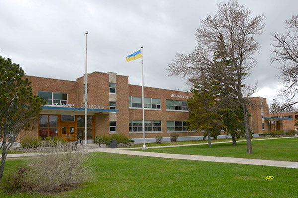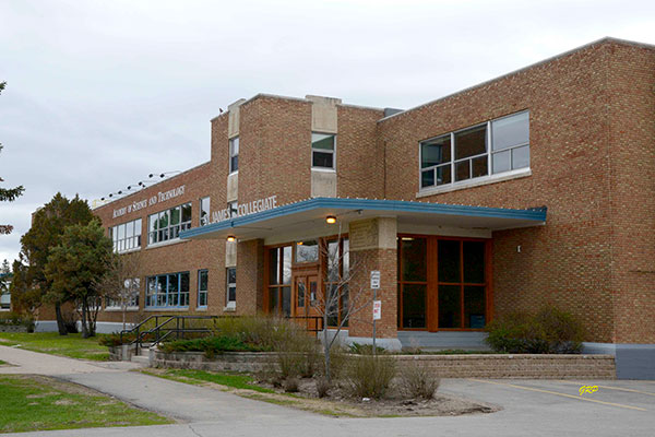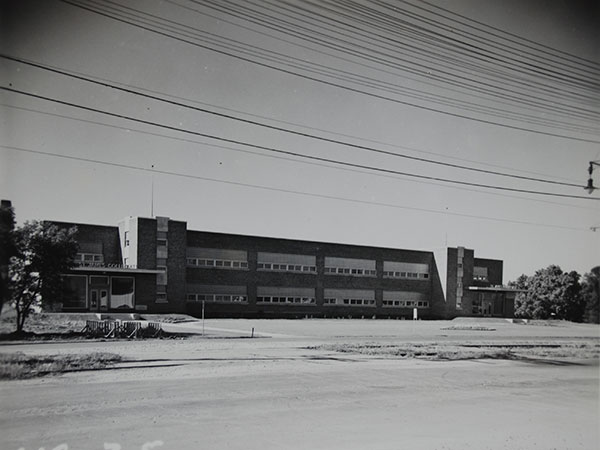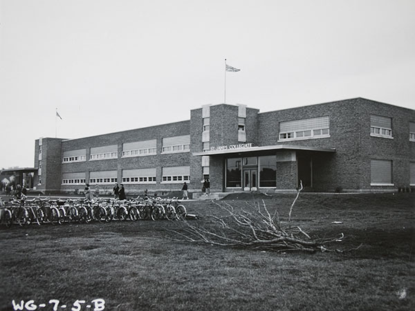 Before the St. James Collegiate building was constructed, high school students from this area of Winnipeg attended classes at Britannia School or Linwood School. On 24 February 1951, School Inspector Elbridge Doty Parker laid the cornerstone for a new building at this site, along with Education Minister Wallace Conrad Miller, School Board Chairman T. B. Findlay, and St. James Mayor Reginald Frederick Wightman. The initial building was constructed later that year, by the construction firm of Couture and Toupin, at a cost of about $355,000.
