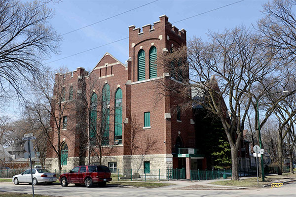This former Presbyterian church at the corner of Cathedral Avenue and Charles Street in Winnipeg was constructed between 1914 and 1923. The foundation was designed by local architect Ralph L. Smith in 1914 but outbreak of the First World War and the lack of adequate finances delayed erection of the superstructure until 1923.