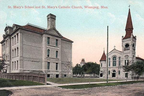 A three-storey brick and stone school on St. Mary Avenue at Hargrave Street in Winnipeg, one block east of Alexandra School, was designed by architect Samuel Hooper and constructed between 1903 and 1904 by the Manitoba Construction Company. Administered by Catholic educators, the school operated until closing in 1968. A fire on 28 November 1969 sealed its fate and the building was demolished in 1971. The site is now occupied by a hotel.