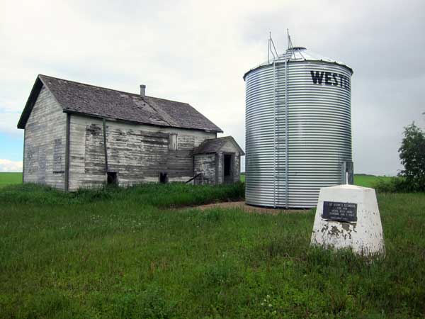 The St. Mary’s School District was organized formally in July 1885 and a school building was erected the following year on the southwest quarter of 30-20-26 west of the Principal Meridian in what is now the Rural Municipality of Riding Mountain West. It closed in January 1967 and remaining students went to Angus School No. 1487. The building, converted to a granary, still remains at the site and a monument dedicated in 1984 stands nearby.