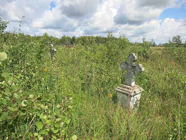 A Ukrainian Orthodox cemetery, at the long-abandoned village of Rofton in the Rural Municipality of Stuartburn, is located in a community pasture. The trail to the cemetery, a three-mile walk from the nearest public road, is inaccessible by vehicles except under very dry conditions. Surrounded by a fence that keeps cattle from entering the cemetery, no maintenance has occurred in several years and the site is being slowly overgrown by trees.