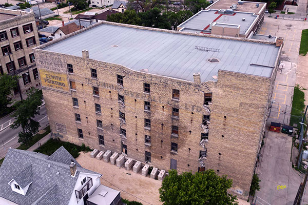 Aerial view of the former Western Paper Box Warehouse (July 2024)