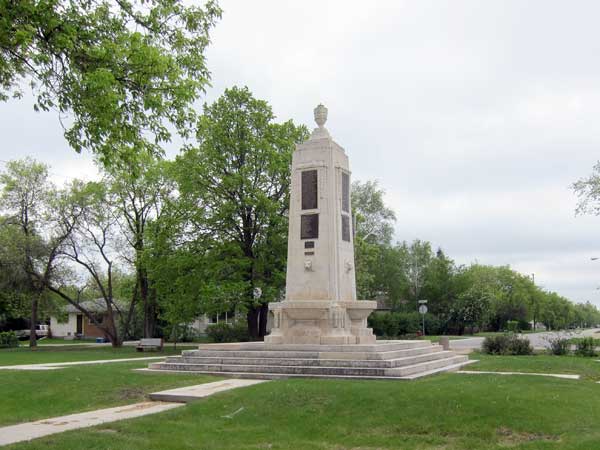 Unveiled on 7 October 1922 in memory of First World War veterans killed in action, the monument designed by Gilbert Parfitt of Winnipeg is made of Tyndall stone. Surrounded by a terrace with steps mounting on opposite sides, on four sides are four bronze tablets bearing 102 names. It was later expanded to commemorate veterans of the Second World War and Korean War, as well as Peacekeepers.
