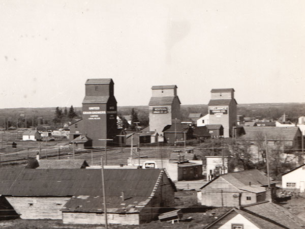Pioneer grain elevator at Strathclair, owned at the time by the Western Grain Company, and bracketed on each side by a United Grain Growers grain elevator on the left and a Reliance Grain Company grain elevator on the right (no date)