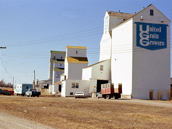 In the background of this photo of the United Grain Growers grain elevators at Strathclair is the original Manitoba Pool grain elevator being used as an annex for a newer elevator (1971)