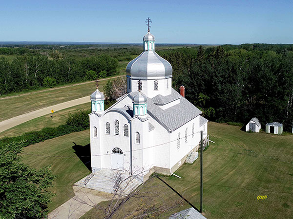 Aerial view of Sts. Peter and Paul Ukrainian Greek Orthodox Church in Ethelbert (August 2019)