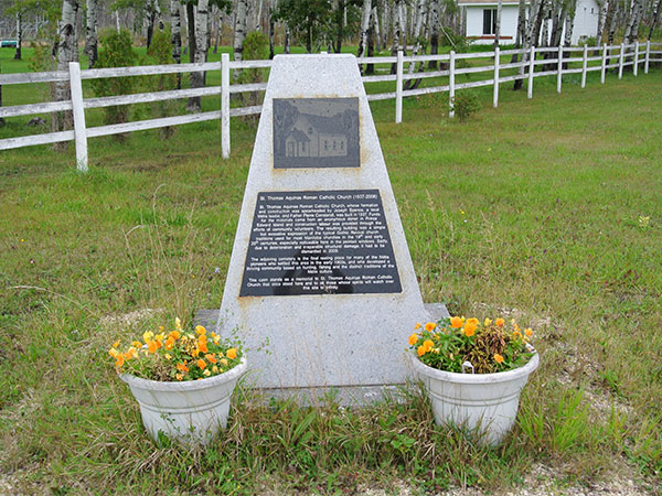 A monument marks the former location, at SW31-24-12W in the Rural Municipality of Alonsa, of the St. Thomas Aquinas Roman Catholic Church. The simple wood frame structure was built in 1937, with guidance from local leader Joseph Spence and priest Pierre Constandt, using volunteer labour and funds provided by an anonymous donor in Prince Edward Island. The first burial in its cemetery occurred that same year.