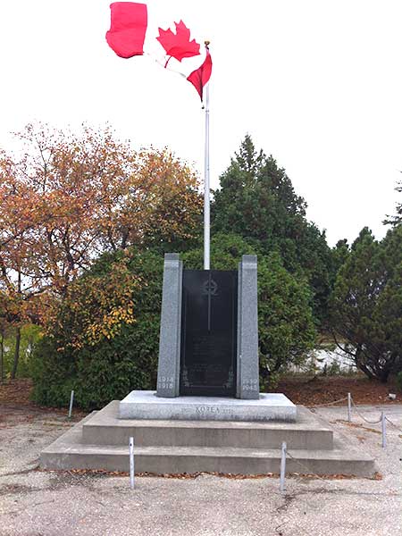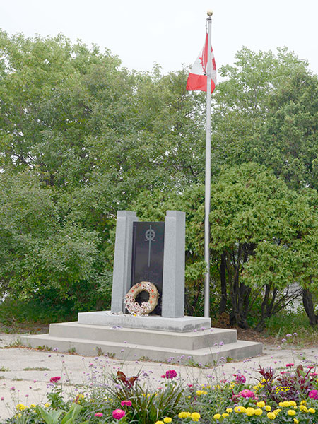 This monument in Guay Park in St. Vital (named for pioneer Abraham Guay) was erected in 1955 to commemorate men and women from the St. Vital area killed during service in the First World War, Second World War, and Korean War.