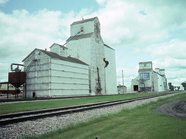 Manitoba Pool grain elevator at Swan Lake, with the United Grain Growers and Paterson Grain elevators in the background (July 1992)
