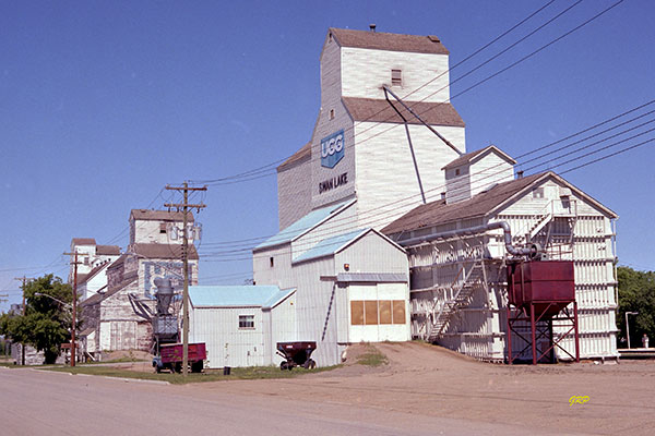 Built in 1954, a 111,500-bushel wooden grain elevator and its two annexes at Swan Lake, on the CNR Carman Subdivision in the Municipality of Lorne, were bought from Federal Grain in 1960 by Manitoba Pool Elevators. In 1971, they were traded to United Grain Growers.