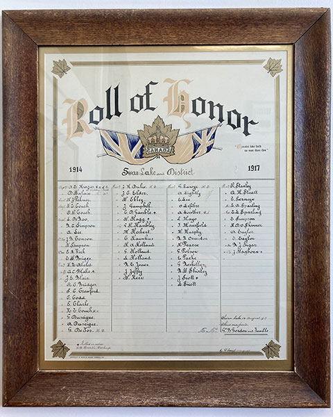 Honour rolls and a commemorative plaque for war dead from Swan Lake are displayed in the basement of the Swan Lake Hospital.