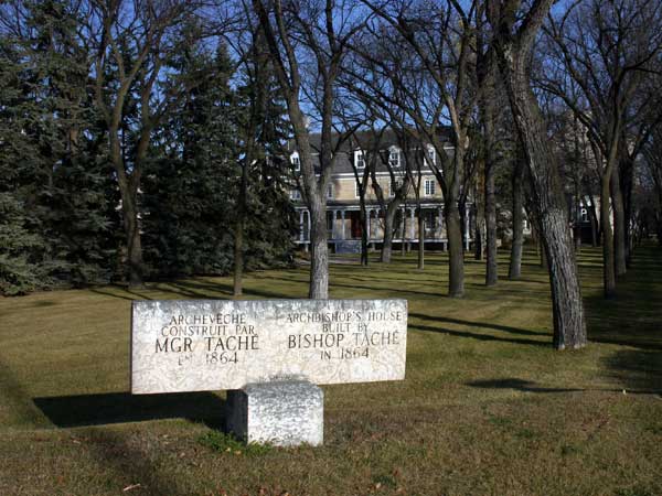 A simple limestone marker at the northeast corner of Tache Avenue and Avenue de la Cathedrale in Winnipeg, dated 16 July 1968, commemorates a residence built by Archbishop Taché in 1864.