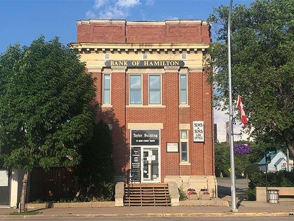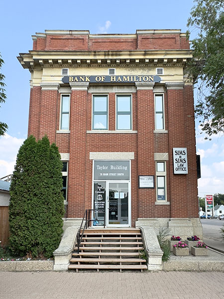 This two-storey red brick structure on Main Street in Minnedosa was originally a branch of the Bank of Hamilton, it was later owned by Henry Stephen Taylor. Today, it houses professional offices.