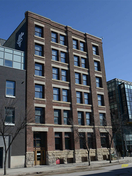 This six-storey brick building in Winnipeg’s Exchange District was designed by local architect James H. Cadham and built between 1905 and 1906 for businessman James Tees and John Persse. It was later integrated into the Princess Street Campus of Red River College. In 2003, the municipally-designated historic building received a Conservation Award from Heritage Winnipeg.