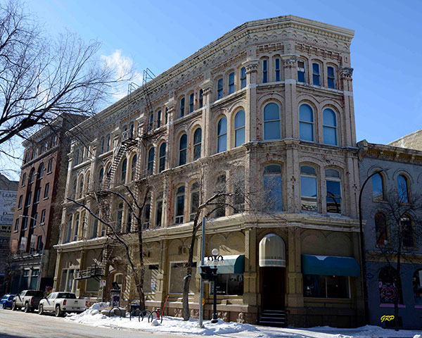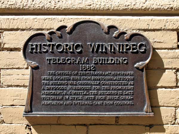 Built on Albert Street in 1882, as a dry goods warehouse for merchant Robert Jones Whitla, the offices of the Winnipeg Telegram newspaper were located here from 1899 to 1920. The building is late-Victorian in style with rich brick ornamentation and internal cast iron columns. A plaque is mounted on the east side of the building, near one commemorating Newspaper Row. The building is a municipally-designated historic site.