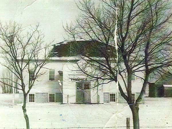 The Thames School District was established in February 1920 and a one-room schoolhouse operated at SE20-2-2W in what is now the Municipality of Rhineland. Increasing student enrollment necessitated the construction of a second school building at the site. In 1938, as enrollment increased even more, the original school was renamed Thames South and a second building, called Thames North, was constructed about two miles north at NW29-2-2W (about N49.16238, W97.69736). The two buildings at the Thames South site were replaced in 1946 by a single, two-classroom structure. A third classroom in its basement was opened in 1959, to accommodate students in grades 9 to 11.