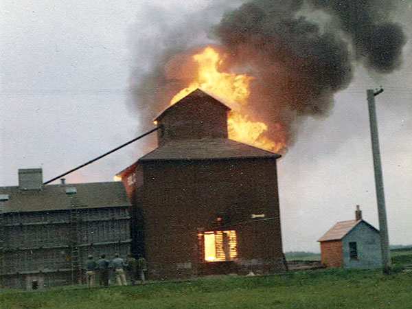 Former Lake of the Woods grain elevator at Thornhill on fire (1962)
