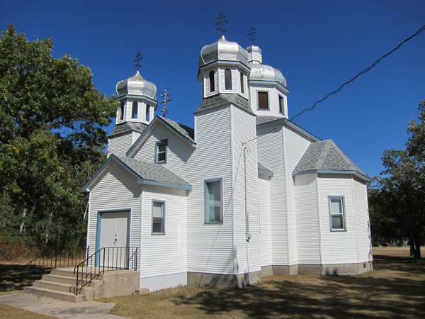 This Ukrainian Orthodox church at Tolstoi in the Municipality of Emerson-Franklin was built in 1927. Also on the site is a rock monument dedicated to the Ukrainian pioneers who settled in this district in 1897 and the organizers of this church. A plaque on a white cross, unveiled on 11 June 2017, honours the founding church pioneers on the 90th anniversary.
