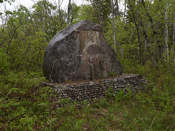 The boulder remains at the overgrown original site beside an abandoned portion of the highway. Also present beside the boulder are two concrete bases for flag poles, presumably for Manitoba and Ontario flags.