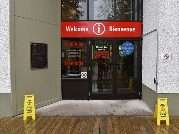 Trans-Canada Highway commemorative monument beside the entrance to a Manitoba tourism centre (June 2019)