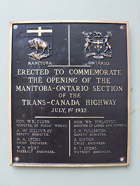 A large boulder marks the spot where the original Trans-Canada Highway crossed the Manitoba-Ontario border. Built by men employed by government relief programs during the Great Depression of the 1930s, the highway in eastern Manitoba was 145½ miles in length, from the intersection of Portage Avenue and Main Street in Winnipeg to Kenora. This portion of the highway opened to vehicle traffic on 2 June 1932 and an official opening ceremony was held on Dominion Day (1 July) 1932. Four days later, the first hitchhikers, a pair of 15-year-old boys from Winnipeg, headed to Kenora on the new highway, allowing themselves two weeks for the return trip.