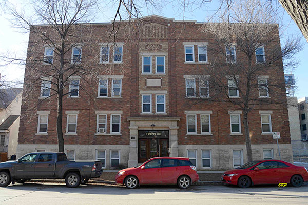 This three-storey brick block on Furby Street in Winnipeg, measuring 74 feet by 121 feet, was designed and built in 1926 by brothers Hannes Pétursson, Olafur Pétursson, and Rögnvaldur Pétursson at a cost of about $100,000. The building contained 36 apartments in its original configuration.