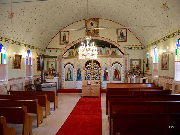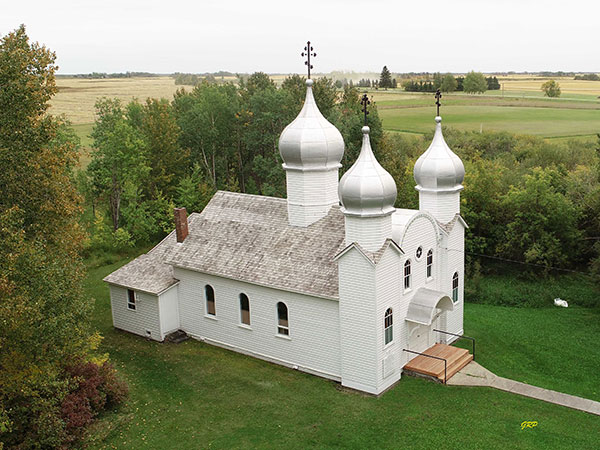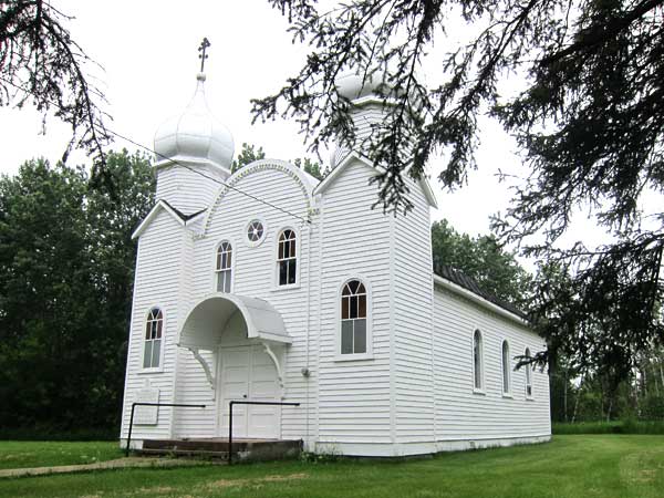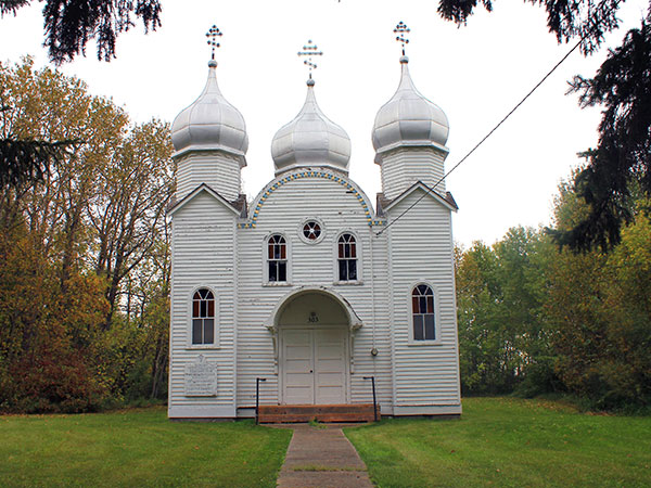 This Ukrainian Greek Orthodox church in Angusville in the Rural Municipality of Riding Mountain West, a municipally-designated historic site as of 2005, was built in 1935. Restoration was done as part of the Manitoba Prairie Churches Project.