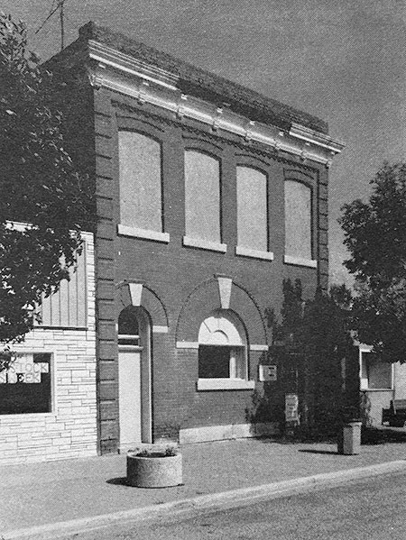 The newspaper was located in the former bank until the mid-1980s. The centrepiece of this Romanesque-inspired structure was the main floor façade with its brick arch and central keystone over the large window and entrance. Segmental arches, fanciful brick work above the second floor windows and a metal cornice with support brackets added a decorative touch.