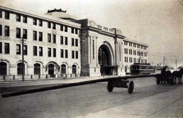 This four-storey Tyndall stone Beaux Arts-style building on Main Street opposite Broadway in Winnipeg, measuring 150 feet by 375 feet, was designed by the New York City-based architects Warren and Wetmore. It was built between 1908 and 1911, with structural steel provided by Dominion Bridge Company, by the construction firm of Lyall-Mitchell as a joint venture between the Grand Trunk Pacific Railway and the Canadian Northern Railway. The cost of construction was an estimated $1,000,000.