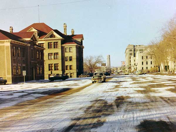 University of Manitoba building at left with the Hudson’s Bay Company store in the background (March 1960)
