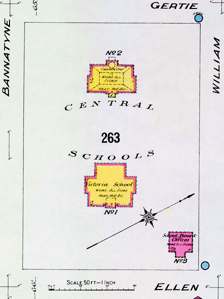 Map of the Central Schools, later renamed Victoria School and Albert School, along with the Winnipeg School Board office building on the site (1906)
