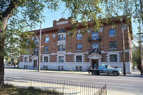 This three-storey brick and stone block at the southwest corner of Broadway at Colony Street in Winnipeg was designed by local architect Victor William Horwood and built in 1909 by owner John Archibald Moxam at a cost of $45,000. The 79 foot by 54 foot building contained thirteen residential apartments with one, two, or three bedrooms.
