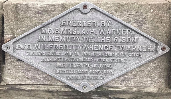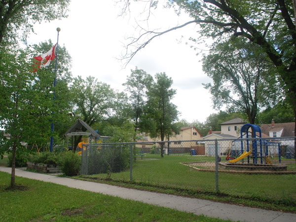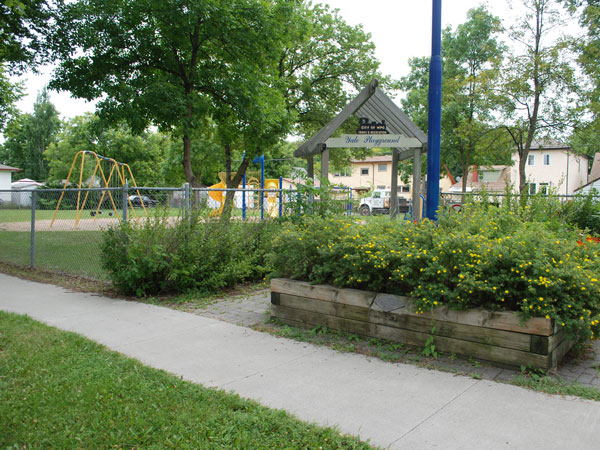 A plaque in the Yale Avenue West Park in Winnipeg commemorates local airman Pilot Officer Wilfred Lawrence Warner (1915-1937) who played in this area during his childhood. Work on the playground and park began around 1946 and it was officially opened on 26 June 1948 by Mayor Andrew Russell Paulley. At the event, a flagpole was unveiled by Warner’s parents and a plaque was affixed.