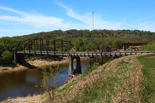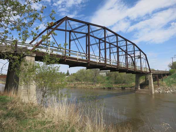 In 1908, this 150-foot long steel through truss bridge was built over the Souris River at Wawanesa, in what is now the Municipality of Oakland-Wawanesa, using Plan No. 727 designed by engineer Archibald McGillivray for the Algoma Steel Company of Winnipeg. Described in some sources as the “Black Bridge,” it was closed to all but pedestrian traffic at the time of a visit in early 2013.