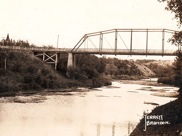 Postcard view of steel through truss bridge #727 over the Souris River (no date) by Ernest Jerrett