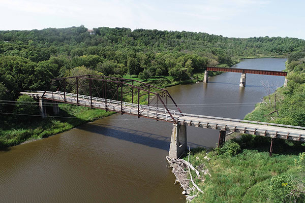 Aerial view of steel through truss bridge #727 over the Souris River (August 2020)