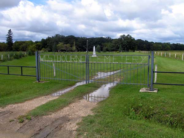 A monument near the entrance to this cemetery in the Municipality of WestLake-Gladstone describes its history. Consecrated on 24 September 1861, it was the most western extension of the Church Missionary Society situated in the White Mud River Settlement near the “First Crossing.” Bishop Anderson named this mission “Westbourne” after their first Anglican missionary, the Reverend John West. Parish Lot No. 9 also included the church mission, parsonage, and school.