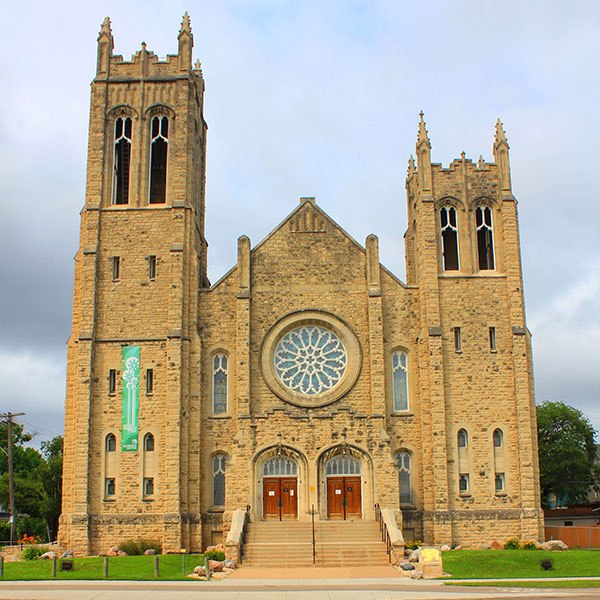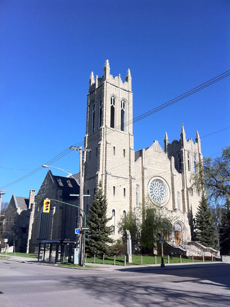 During the early 20th century, Manitoba’s economy boomed and its population grew dramatically. With sharp increases in memberships, many churches found it necessary to replace their buildings. In 1909, the members of Westminster Presbyterian (now United) Church concluded that their 1893-1894 building was inadequate for a congregation of almost 1,000. This site, closer to the homes of the parishioners, was selected and the church was built between 1910 and 1912. For its grandest buildings—Westminster, Augustine (1903-1904) and Knox (1914-1918)—the Presbyterian Church in Winnipeg called upon renowned architect J. H. G. Russell. For each church, Russell relied on a different interpretation of the Gothic Revival, a popular architectural style that drew its inspiration from medieval churches. Russell’s design was based upon the English expression of Gothic and emphasized pinnacle towers, slender vertical supports and large openings, in this case featuring a beautiful rose window.