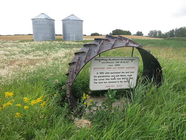 A monument in the Municipality of Prairie View was erected in 1988 to commemorate the Wiggins family, who homesteaded at SW18-13-25W since 1882. In 1902, William John Wiggins (1881-1959) purchased the site of the monument from his grandmother and, with his wife Minnie Tate Ford (1889-1969), farmed here from 1913 to 1959.
