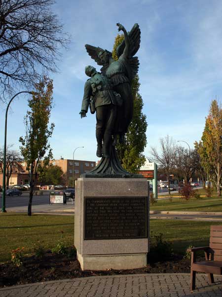 Located on the front grounds of Deer Lodge Hospital at 2109 Portage Avenue in Winnipeg, this bronze statue was created by Montreal sculptor Coeur de Lion McCarthy (1881-1979) and dedicated to employees of the Canadian Pacific Railway (CPR) who were killed during military service in the First World War.
