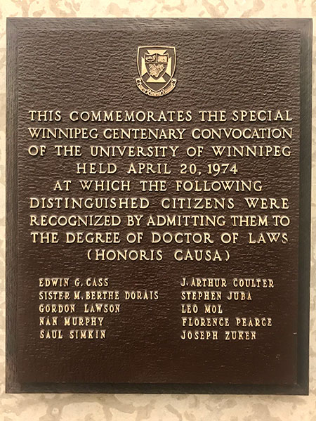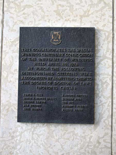 Commemorative plaque for citizens receiving honorary doctorates from the University of Winnipeg in April 1974 (September 2022)