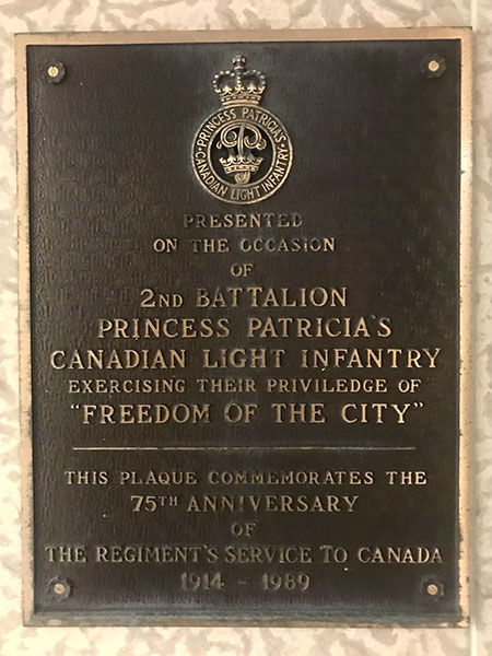 Second Battalion Princess Patricia’s Canadian Light Infantry “Freedom of the City” Plaque, 1989 (September 2022)