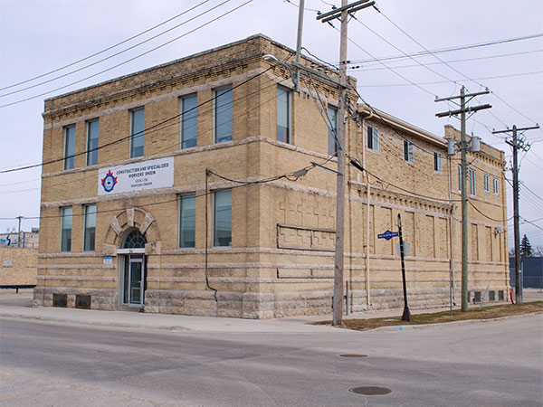 This Winnipeg property, located on the northeast corner of Waterfront Drive and MacDonald Avenue, was acquired by the city government in 1906 as the site for a substation to receive electrical power from the Winnipeg Electric Railway Company’s generating station on the Winnipeg River, the Pinawa Hydroelectric Power Dam. Designed by H. R. Eade and W. C. Eade, construction of the two-storey brick and stone structure began under the supervision of contractor John Saul in the late fall of 1906. The concrete foundation was laid before winter set in, with work resuming in spring 1907. Completed at a cost of $19,000, the 50 by 66 foot building opened around September 1907 when it was turned over to the City’s Electrical Department. Inside were transformers and controls for managing 2,000 streets lamps, along with lamp repair facilities and store rooms. Atop the building was a tall steel wire tower erected by Vulcan Iron Works.