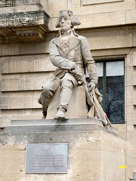 Major General James Wolfe (1727-1759) led the British forces and died in taking Quebec at the first Battle of the Plains of Abraham on 13 September 1759. Effective rule over Canada from France was thus ended and the cessation of Canada to Great Britain was completed in 1763. This statue is mounted on the west side of the Legislative Building, facing Osborne Street.