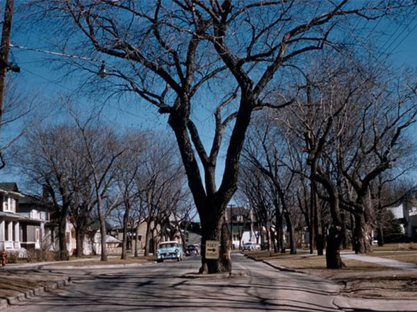 This famous tree stood in the middle of Wolseley Avenue at the foot of Basswood Place in Winnipeg. It was planted in the 1860s on the river lot farm of Joseph Good and his wife Mary Ann Kirton Good. The sapling had been rafted down the river from Baie St. Paul. In 1957, the city decided that it had to be removed to build a new road. Mrs. Borrowman of 1192 Wolseley (widow of LeRoy F. Borrowman) and other neighbours petitioned city council to stop this action and won their case. The road was built winding around the tree. A second onslaught by the City was successful and the tree was cut down in July 1960.